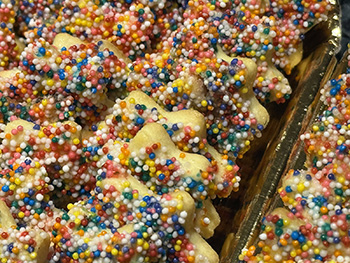 Available in a 22 oz jar, and for this month only, also offered in a 1 lb tray. Made with: flour, butter, sugar, eggs, baking powder, Galliano liqueur, lemon, salt, anise seed, and nonpareil sugar. Nut free.