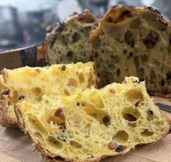 Handcrafted in the spirit of Northern Italy’s festive breads, our Salettone brings a savory soul to the traditional panettone. Made with a rich, slow-risen buttery dough, this loaf is folded with Fontina cheese, mortadella, salami, and green olives, then gently seasoned with cracked black pepper and a touch of paprika for warmth.